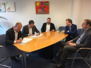 Directeur-bestuurder Alfred van den Bosch van Woonvisie ondertekent de samenwerking met Richard van der Zee van SKARP, onder toeziend oog van Peter Kranenburg en Willem van Overveld van Woonvisie en Feike Verweij van HC&H.