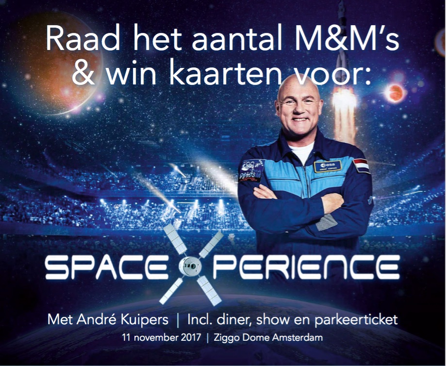 Raad het aantal M&M’s in de pot en maak kans op één van de drie tickets (met partner) voor de spaceXperience op 11 november in de Ziggo Dome, inclusief diner en parkeerticket.